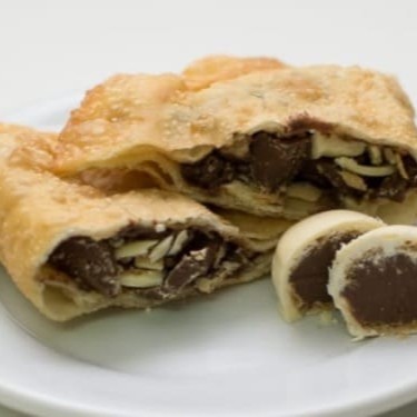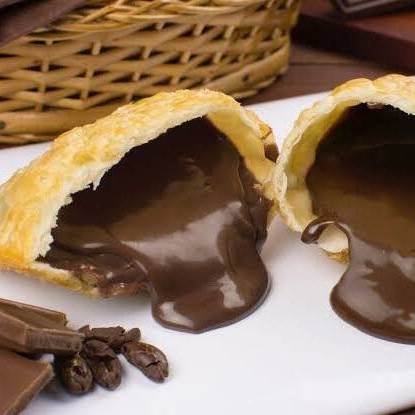 Pastel recheado com chocolate, acompanhado de uma massa sequinha e crocante.