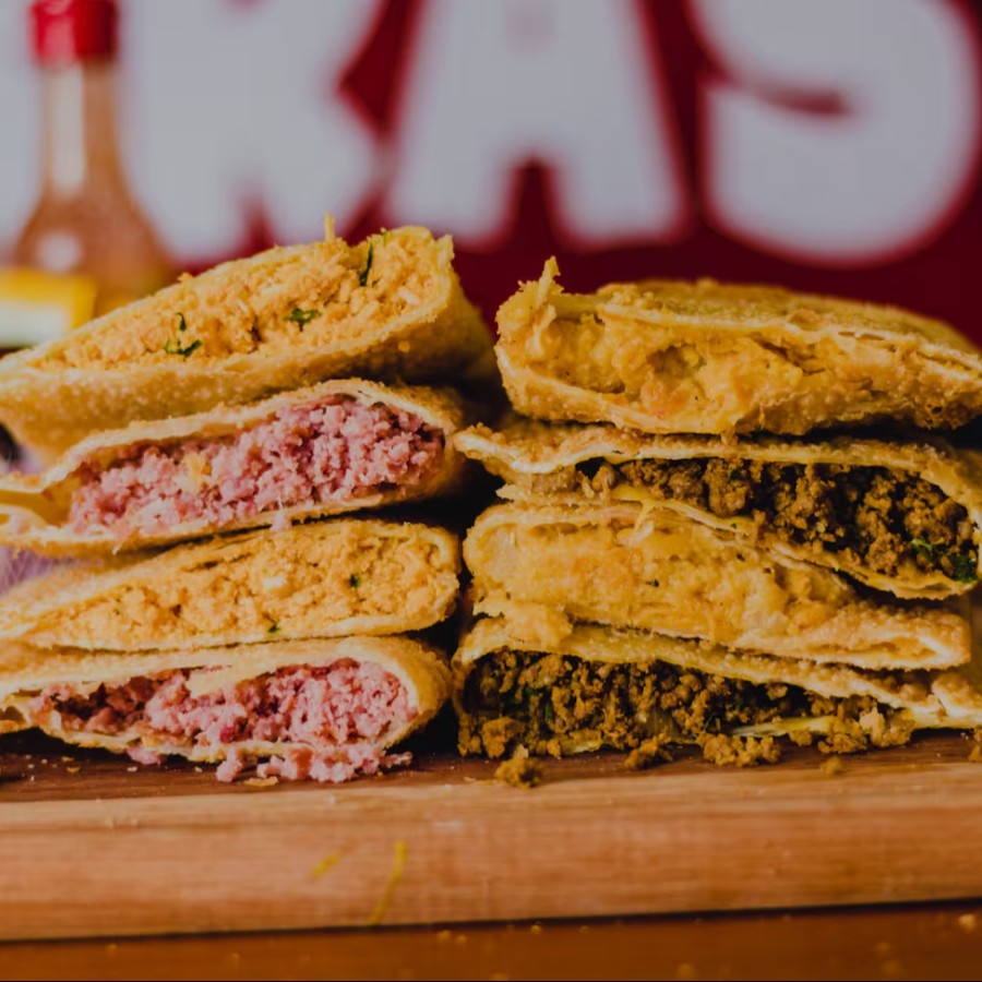 Pastel recheado com carne moída e ovo, montado e frito na hora, aprox. 22 cm. * pastel de feira pesa em média 100gr, o nosso tem o dobro do recheio*.
