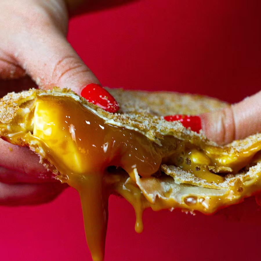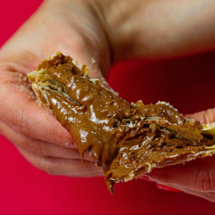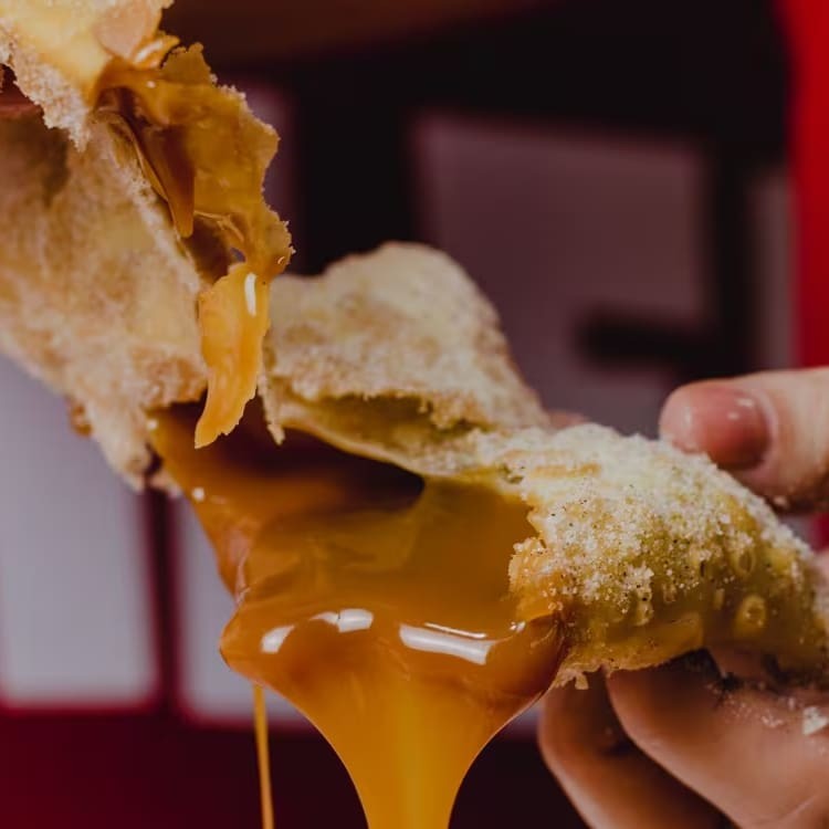 Pastel recheado com doce de leite, montado e frito na hora, aprox. 22 cm.
