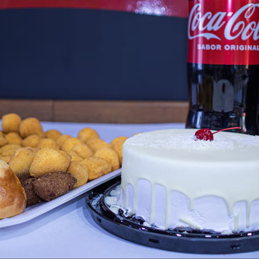 Kit festa contém 600gr de Bolo a sua escolha, 60 salgados tradicionais e 1 coca cola 2lt. Sua festa para até 6 pessoas. Bolo refrigerado, recomenda-se deixar em temperatura ambiente por 1hora antes de consumir.
