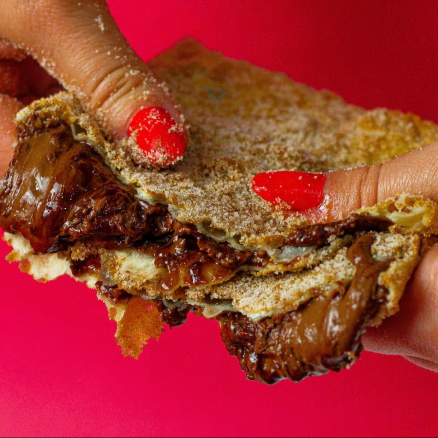 Pastel recheado com banana e chocolate, montado e frito na hora, aprox. 22 cm.