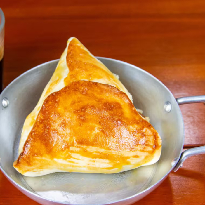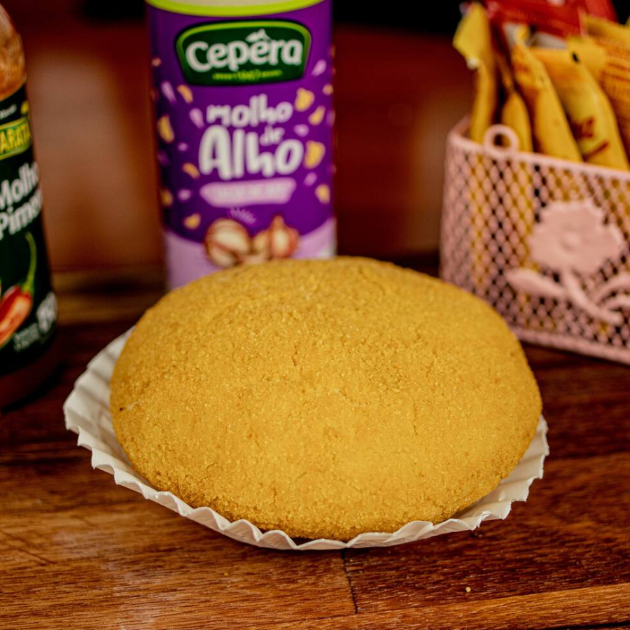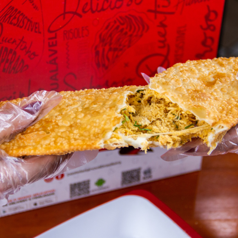 Pastel recheado com frango desfiado c/ catupiry original, montado e frito na hora, aprox. 22 cm. * pastel de feira pesa em média 100gr, o nosso tem o dobro do recheio*.