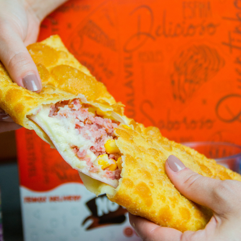 Pastel recheado com Presunto, mussarela, calabresa, ,milho e catupiry original, montado e frito na hora, aprox. 22 cm. * pastel de feira pesa em média 100gr, o nosso tem o dobro do recheio*.