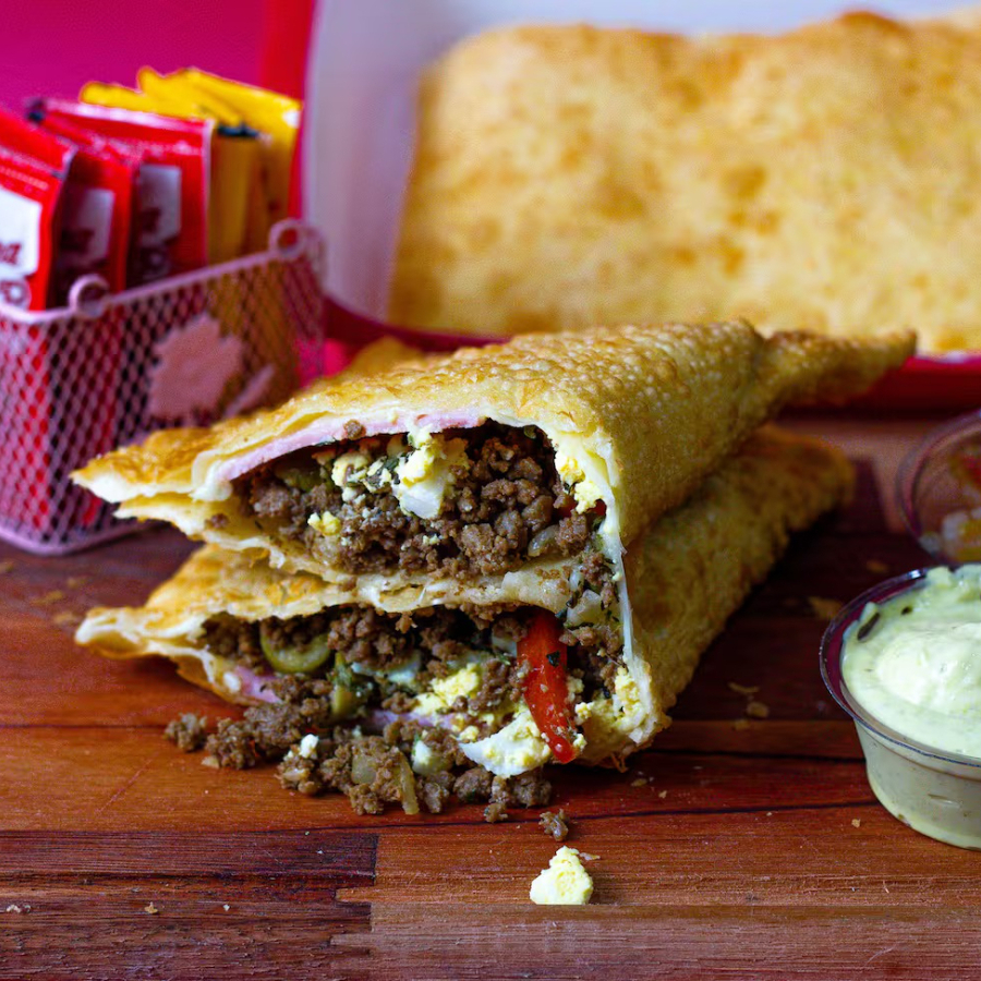 Pastel recheado com carne moida e mussarela, montado e frito na hora, aprox. 22 cm. * pastel de feira pesa em média 100gr, o nosso tem o dobro do recheio*.