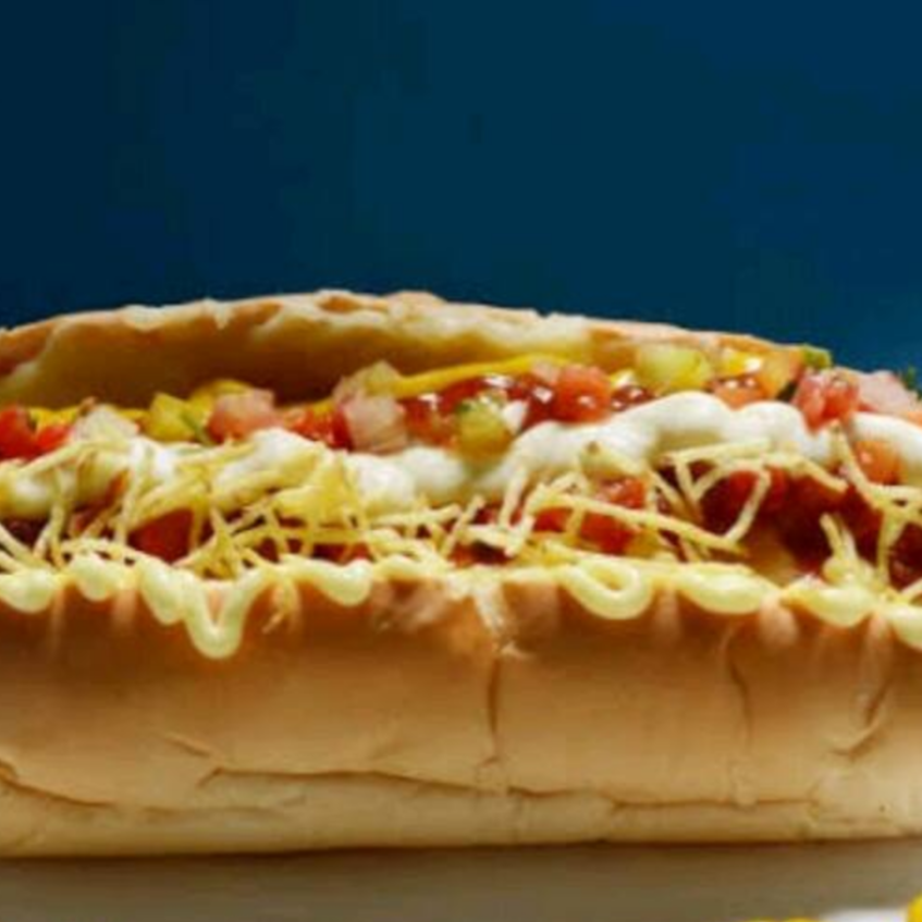 Pão, 2 salsichas, ketchup, mostarda, ovo cozido, azeitonas, queijo e batata palha