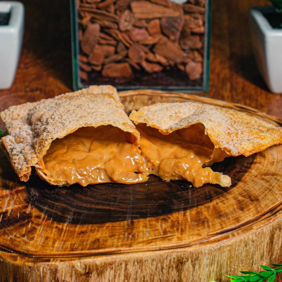 Pastel crocante recheado com doce de leite cremoso, frito até dourar e finalizado com açúcar e canela.