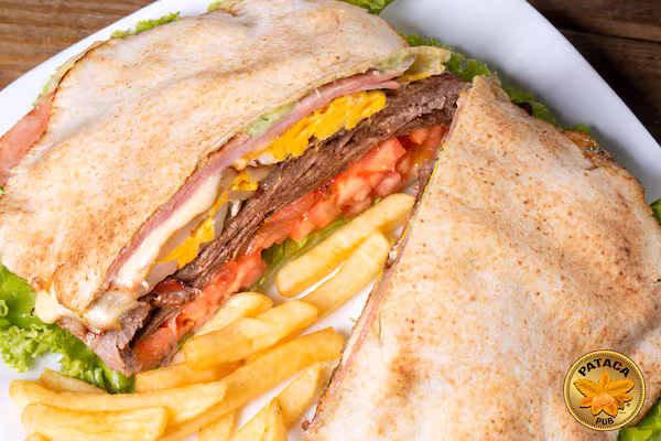 Pão Sírio, Queijo, Presunto, Bacon, Ovo, Alface, Tomate, Molho Verde, Batata Frita