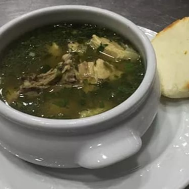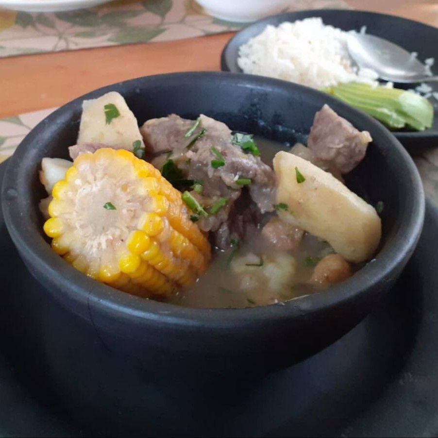 Soupa tradicional colombiana de costela bovina, banana da terra verde, batata, milho, mandioca. Acompanhado com uma porção de arroz e abacate salgado.