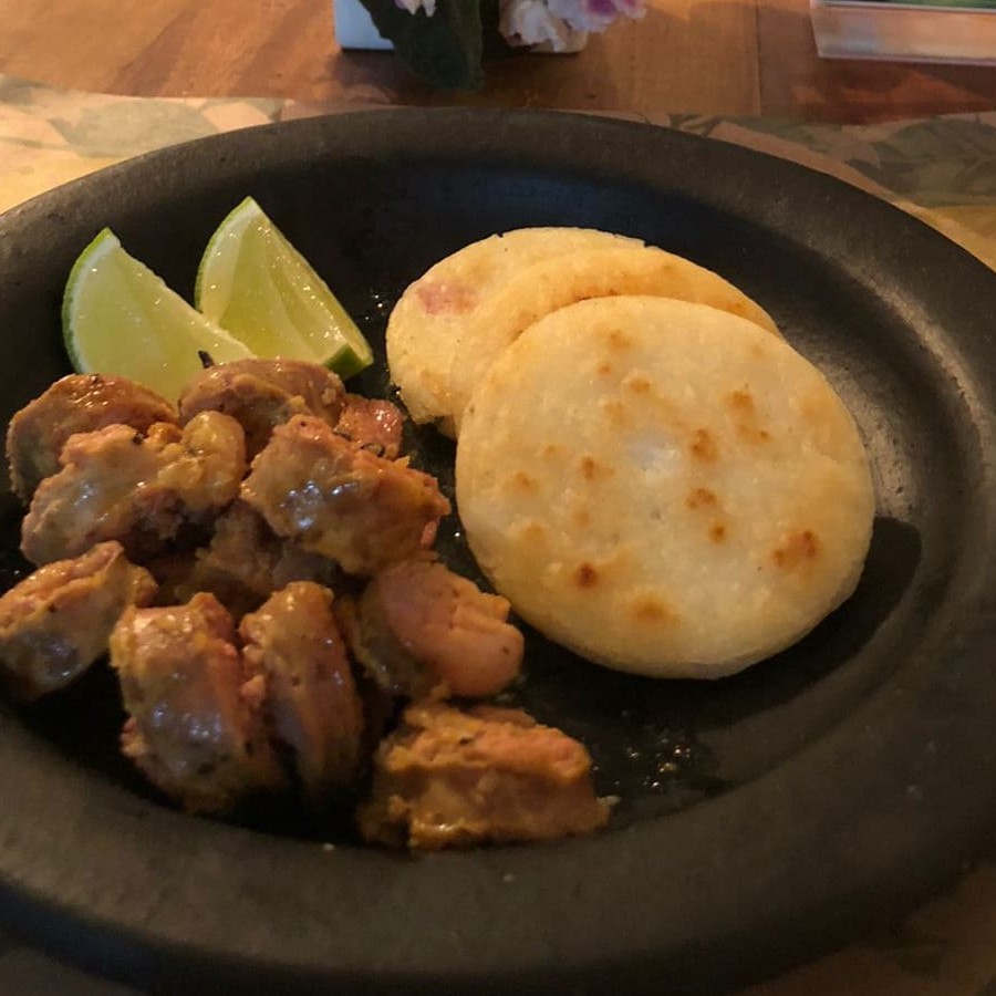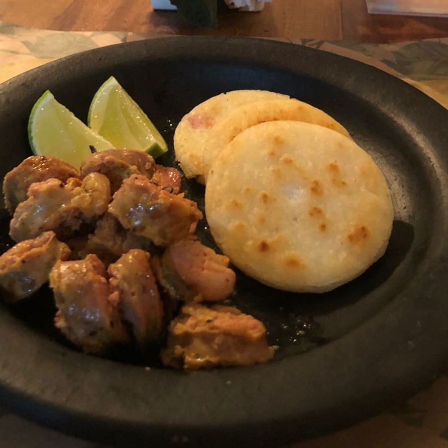 Linguiça de porço receita colombiana com arepas de canjica. Acompanhamentos Limão e pico de gallo colombiano.