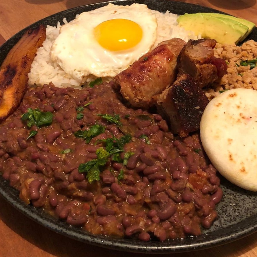 Feijão vermelho, arroz branco, carne moida, ovo frito, arepa de canjica, banana da terra madura frita , torresmo e abacate.