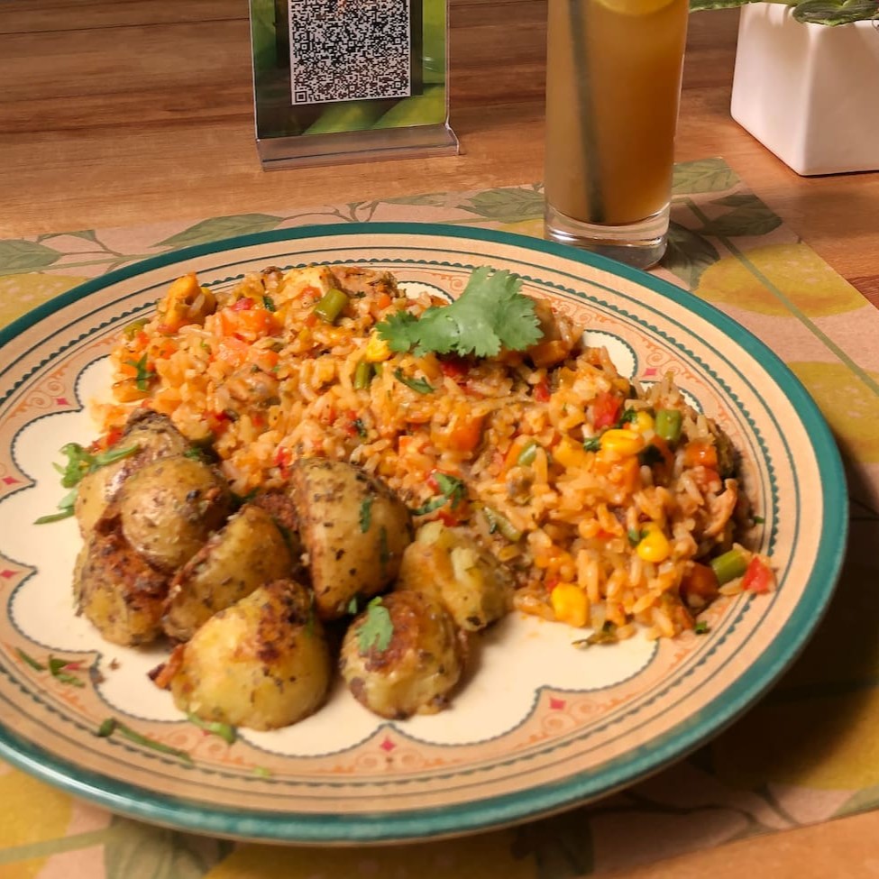 Arroz misturado com linguiça vegana, milho doce, cenoura, vagem fresca, temperado com molho da casa e batata ao forno.