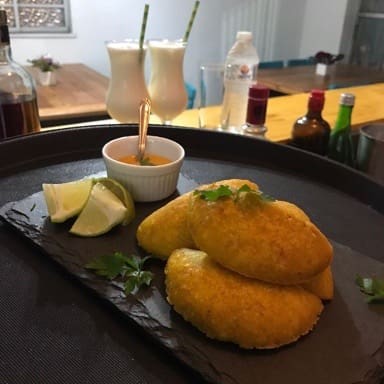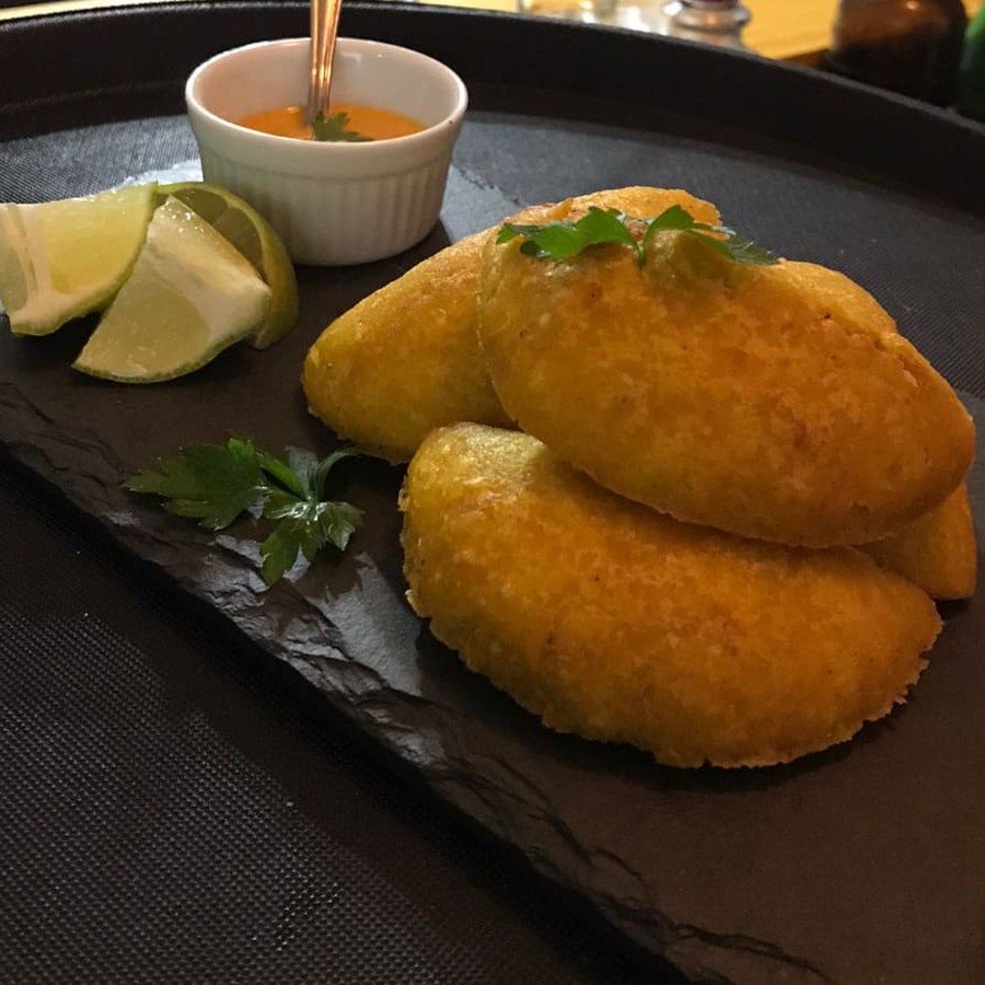 Bolinhos de banana da terra maduro, recheados de peixe ao molho crioulo de maracuja.