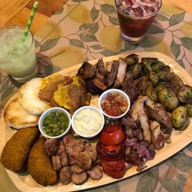 Serve duas pessoas. Duas empanadas, dois patacones, duas arepas, tiras de carne e frango, torresmo, linguiça, tomate na chapa , cebola caramelizada, batata rústica, acompanhados de maionese,Pimenta e guacamole