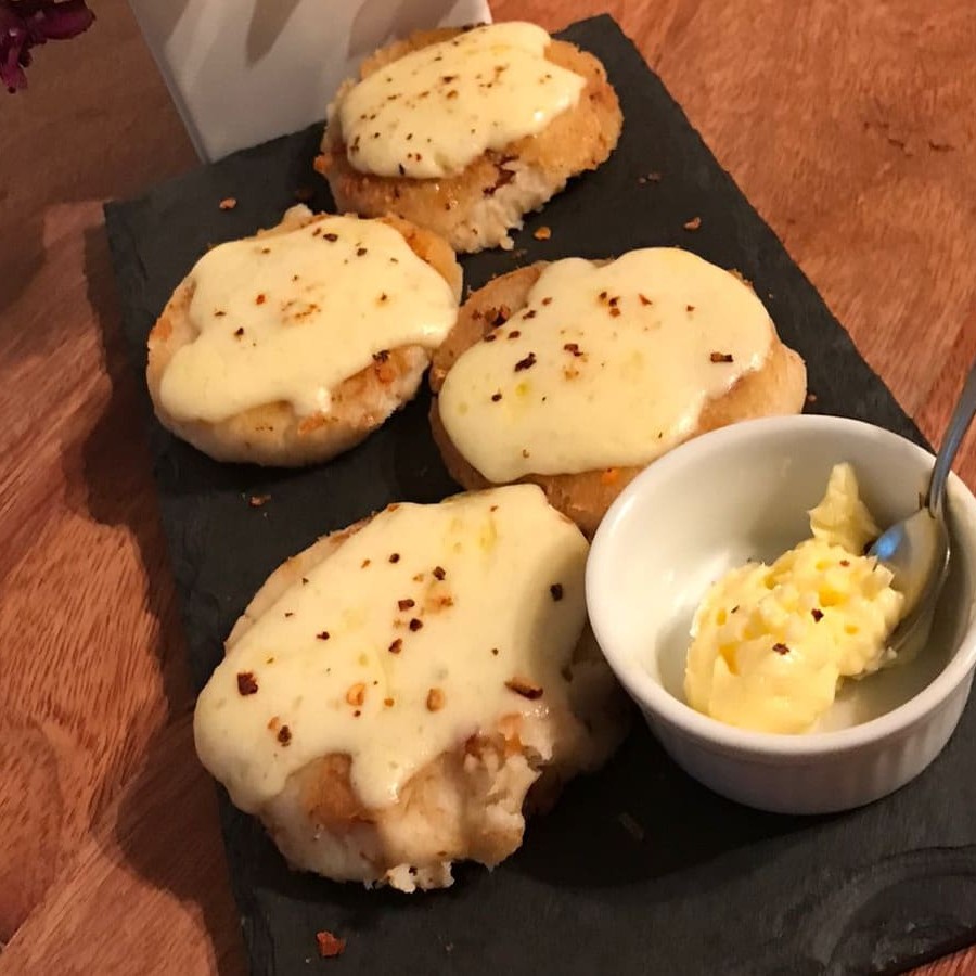 Pasteis de canjica recheados de batata e carne desfiada. Acompanhada de pico de gallo e limão.