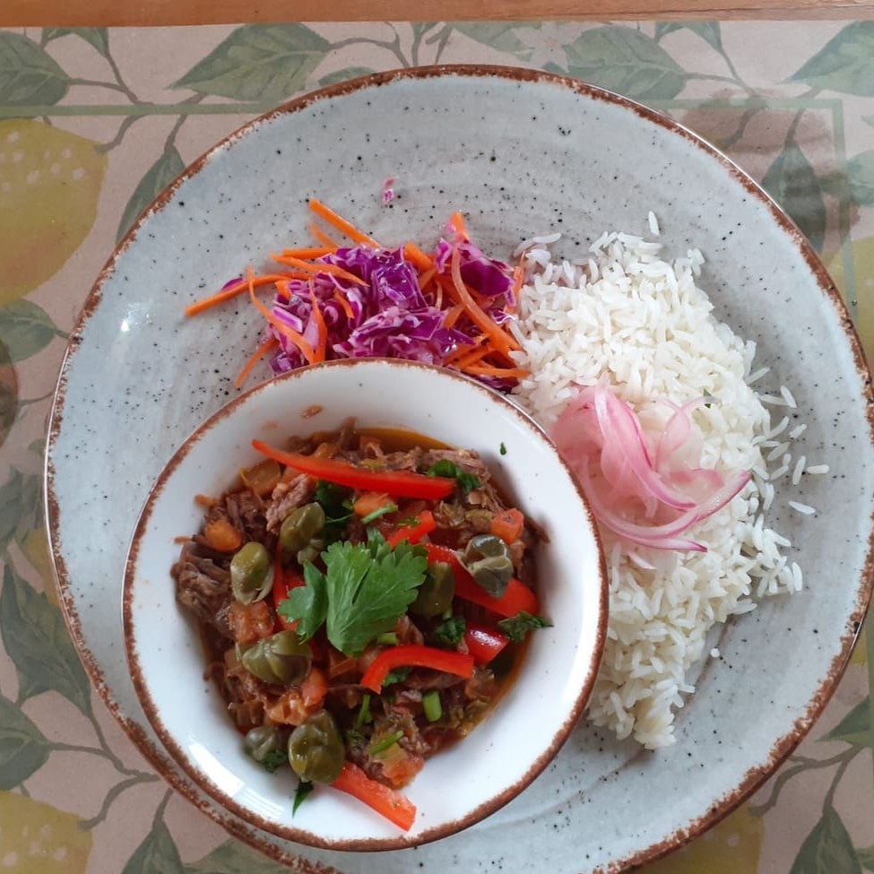 Deliciosa carne de panela ao molho caribenho, acompanhado de arroz e salada de repolho e cenoura com molho melmostarda.