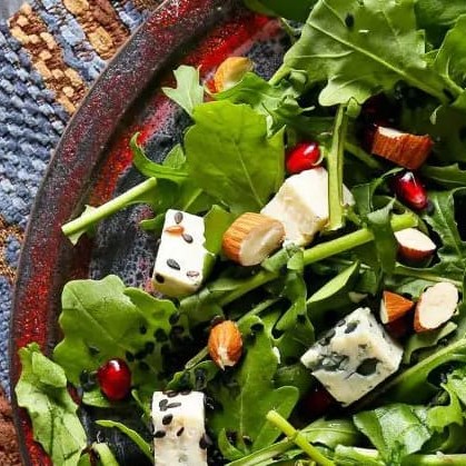 Tomate, mix de folhas, queijo mutzarella bufala, castanhas de caju e vinagrete teia de aranha.