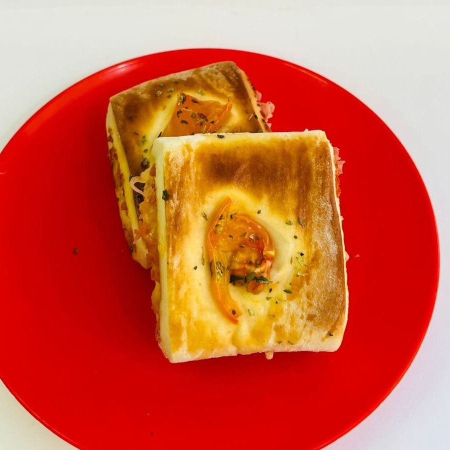 Presunto , queijo e tomate em uma massa deliciosa.