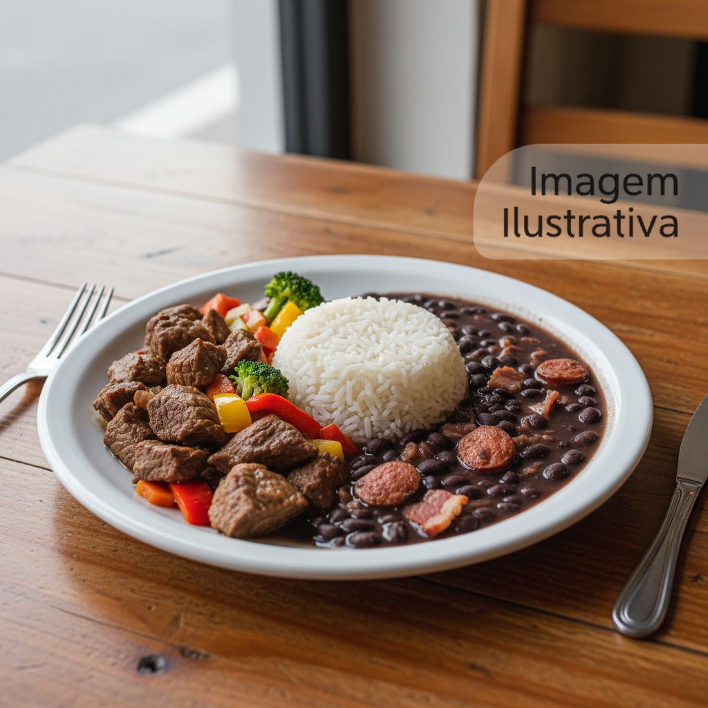Picadinho de carne bovina com legumes frescos, acompanhando arroz e feijão.