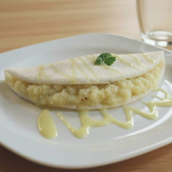 Tapioca especial de preparo próprio, muito bem recheada com doce de leite com banana de alta qualidade. .