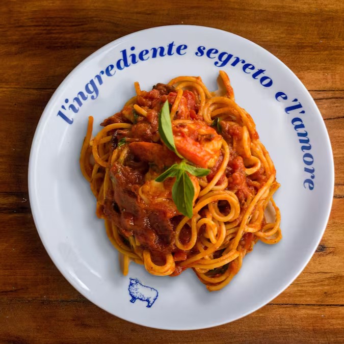 Espaguete com mini lulas, camarões, molho de tomates e pancetta