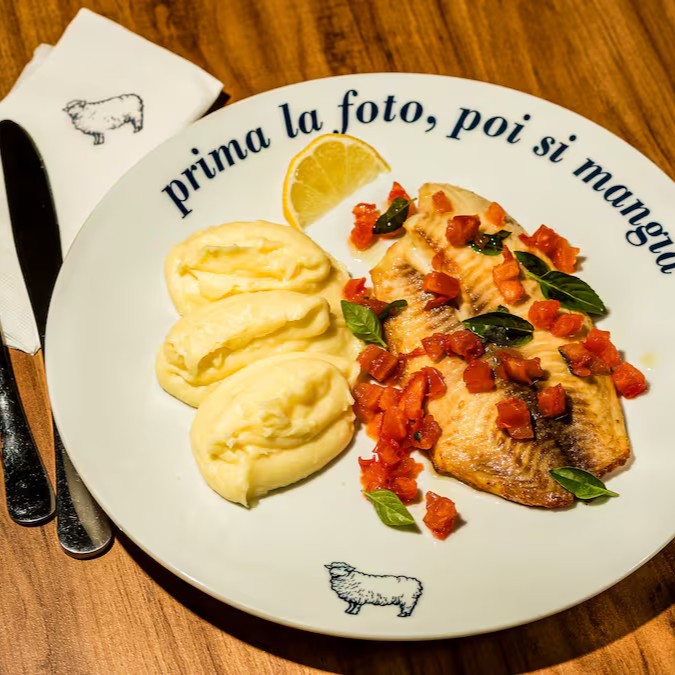 Saint Peter servido com tomate em cubos e manjericão, acompanhado de purê de batatas