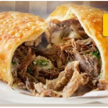 Pastel recheado com Carne Louca e Queijo Mussarela. Obs: Não fazemos alterações de ingredientes.