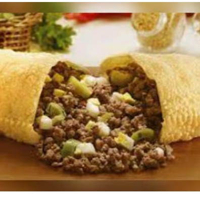 Pastel recheado de Carne moída refogada e azeitona. Obs: Não fazemos alterações de ingredientes.