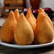 Coxinha recheada de frango temperado e desfiado levemente apimentado com massa leve/saborosa, feita de batatas. Produto crocante e fresquinho. Frito na hora.