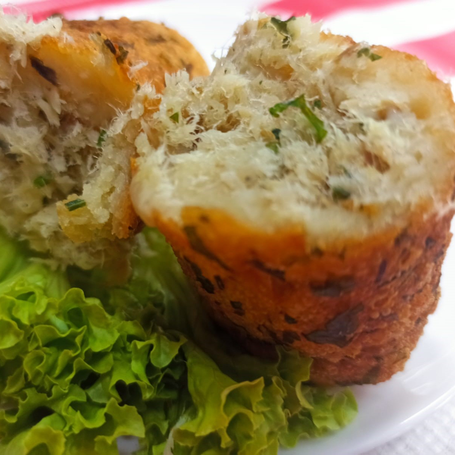 Bolinho recheado de bacalhau temperado e salsinha com massa leve/saborosa, feita de batatas. Produto crocante e fresquinho. Frito na hora.