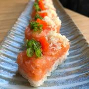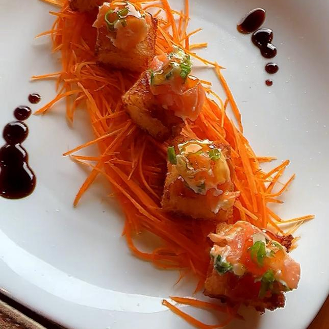 cubo de arroz frito com salmao cru crean cheese geleia de pepeino