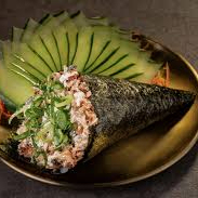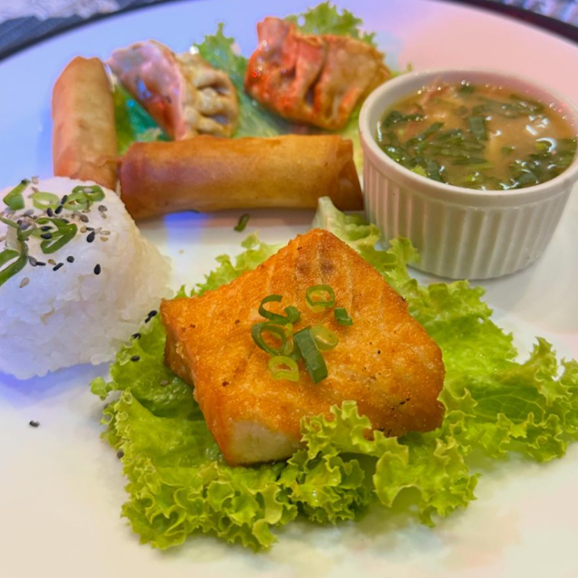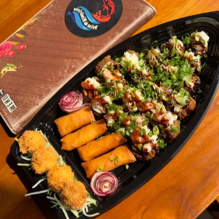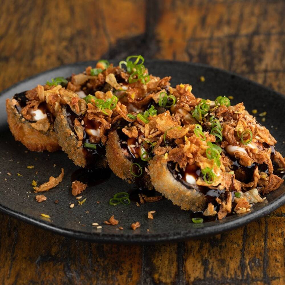 enrolado de nori, salmao, kani, empanado e frito, cream cheese, cebola empanada e frita, tare acompanha 01 hashi, 01 tare, 01 shoyo