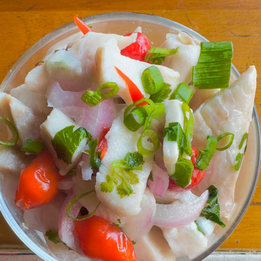 Isca de peixa cortada e pedacinhos refogada, molho, farinha de mandioca e tempero especial da casa acompanha pão