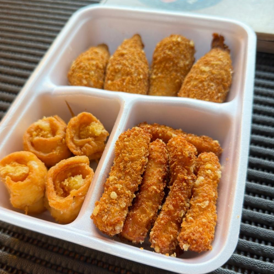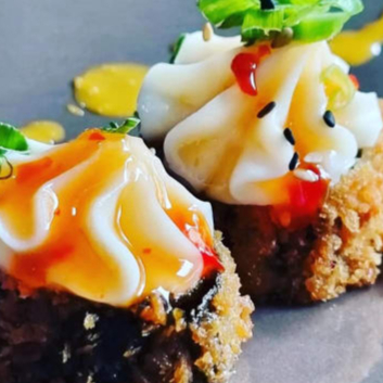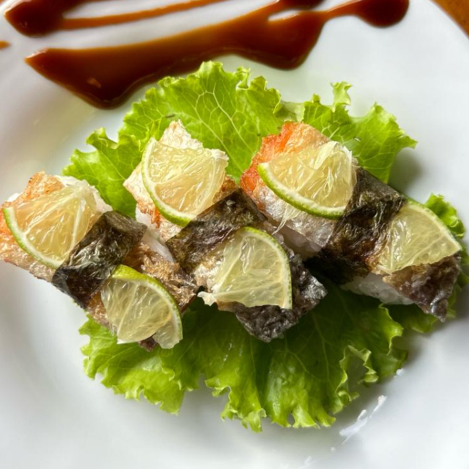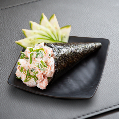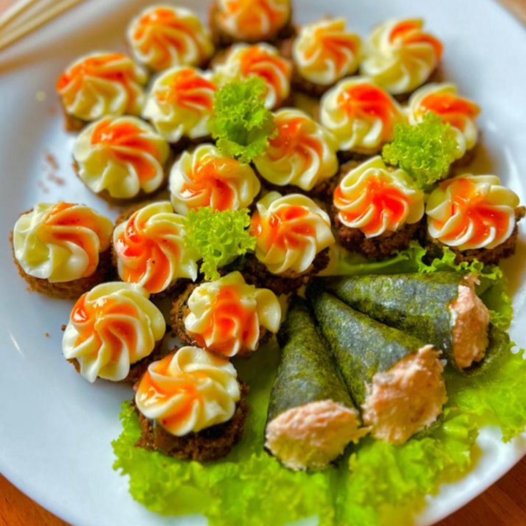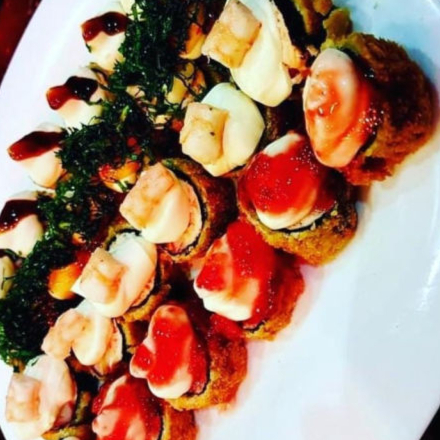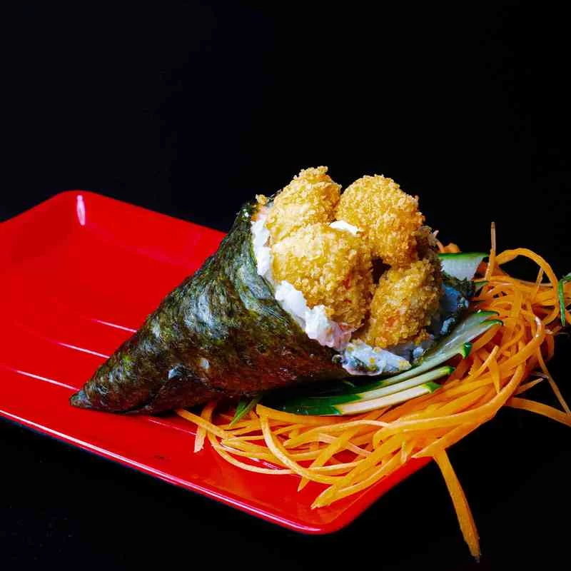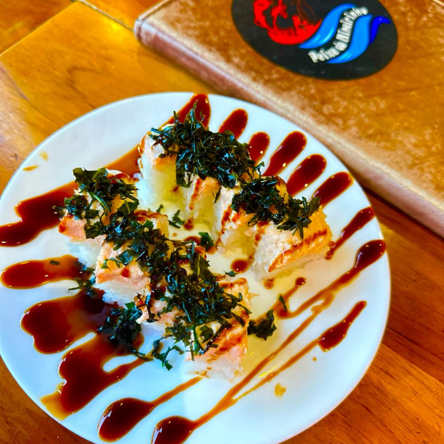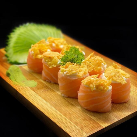 Enrolado de salmão, kani, camarão em cima , empanado e frito por fora. Acompanha 1 hashi e 1 molho tarê sache.