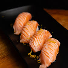 enrolado com arroz por for e gergilim com peçe de salmão grelhada, molho Tare