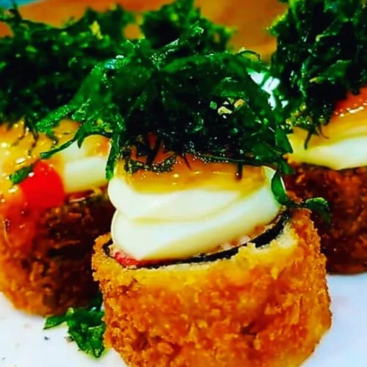 Enrolado de nori c/salmão e kani por dentro empanado e frito