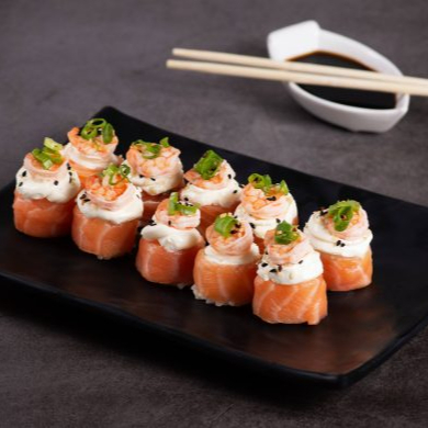 enrolado, Nori, salmão, Kani, empanado frito, cream cheese, camarão encima, cebolinha e tare, acompamha 01 hashi, 01 tare, 01 shoyo