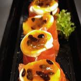 Bolinho de arroz com salmão enrolado , cream cheee e geleia maracuja
