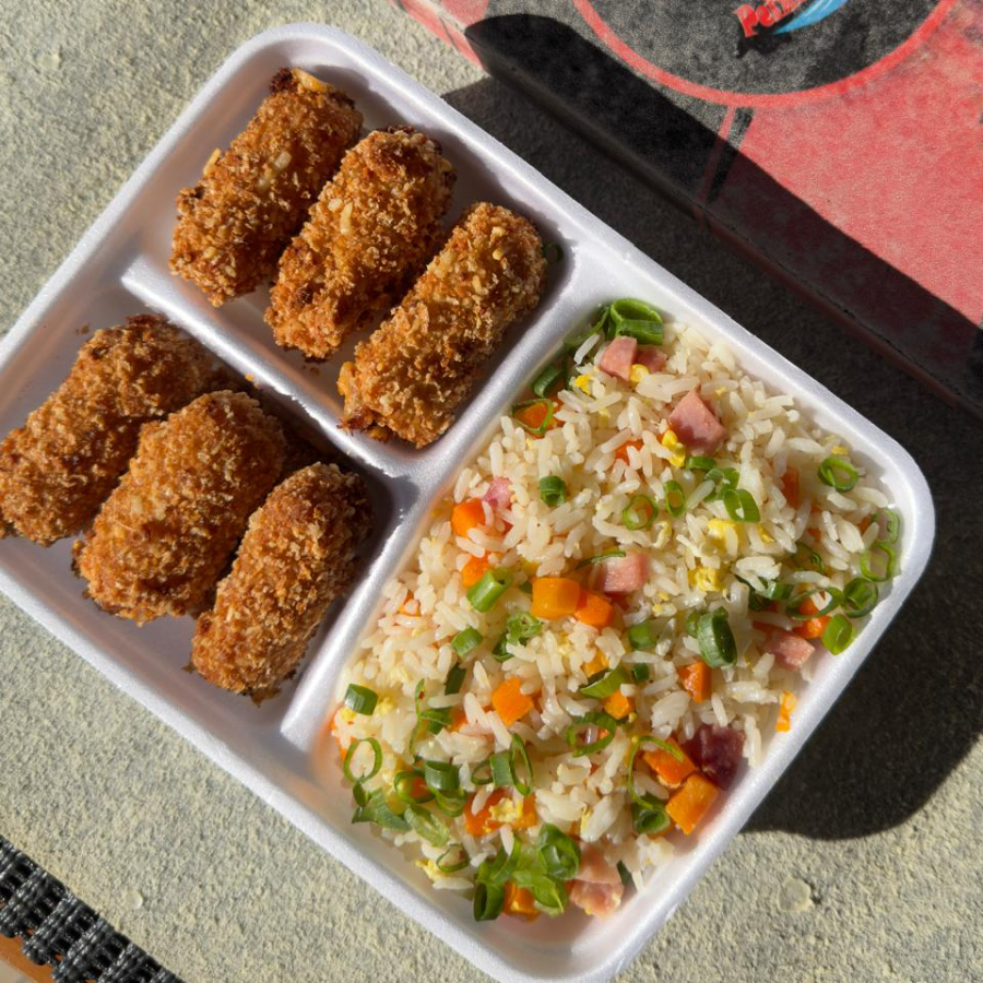 ARROZ CHINEZ TEMPERADO COM CENOURA, CEBOLINHA E PRESUNTO, FLOCO DE OVO, 06 CHARUTINHOS DE TILAPIA