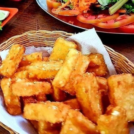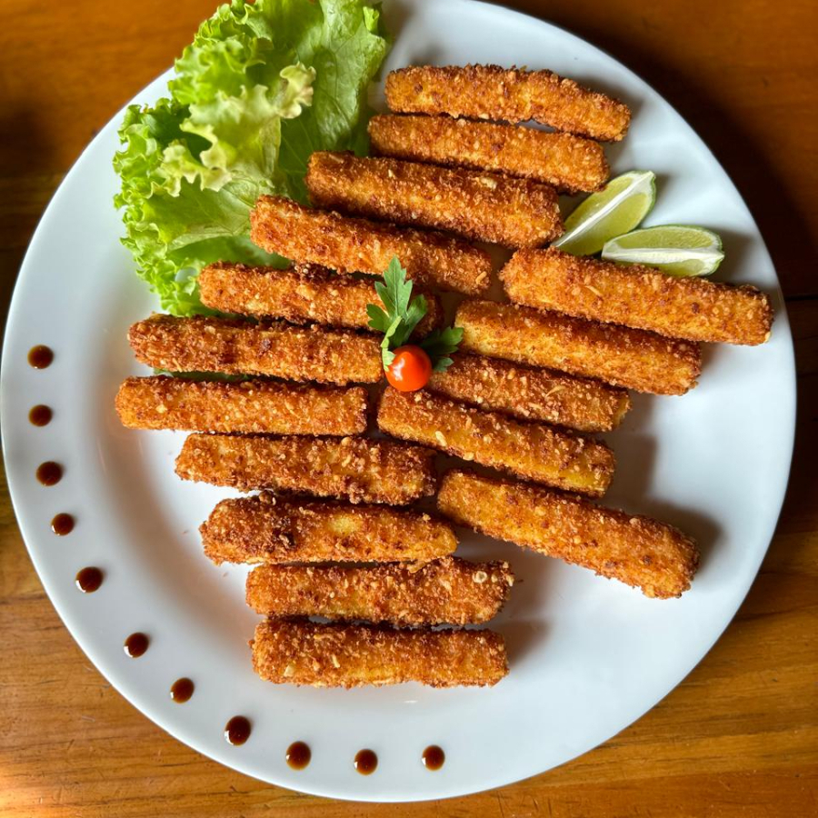 Empanado e frito recheado com provolone 400g - Acompanha 150 gramas batata mais 2 molhos rose - serve ate 3 pessoas