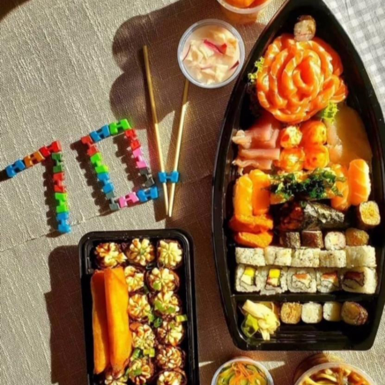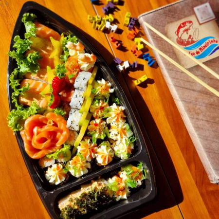 Barca contém, 6 uramaki, 5 Djo, 5 niguiri, 12 hot roll, 5 hossomaki, 200g yakissoba, 4 sashimi de peixe branco, 5 sashimi, 15 camarão alho e óleo, 2 salmão grelhado em cubo, 4 baterá de salmão grelhado. acompanha 2 hashi, 2 shoyo, 1 tarê.