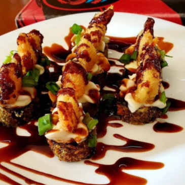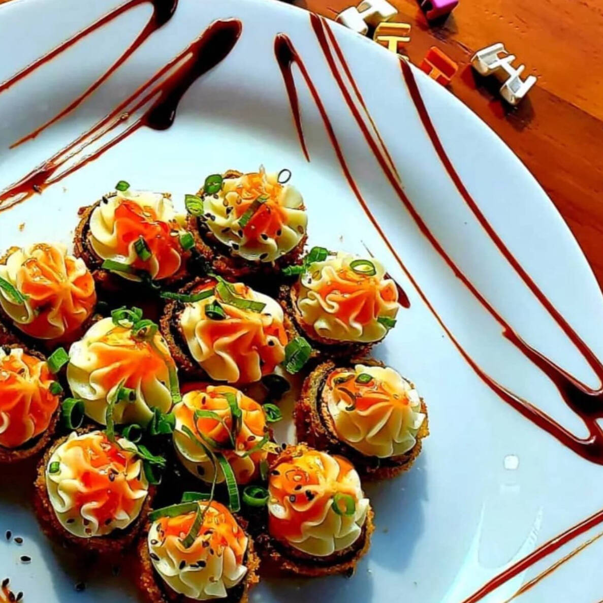 bolinho de arroz com salmão enrolado - com cream cheese e camarão