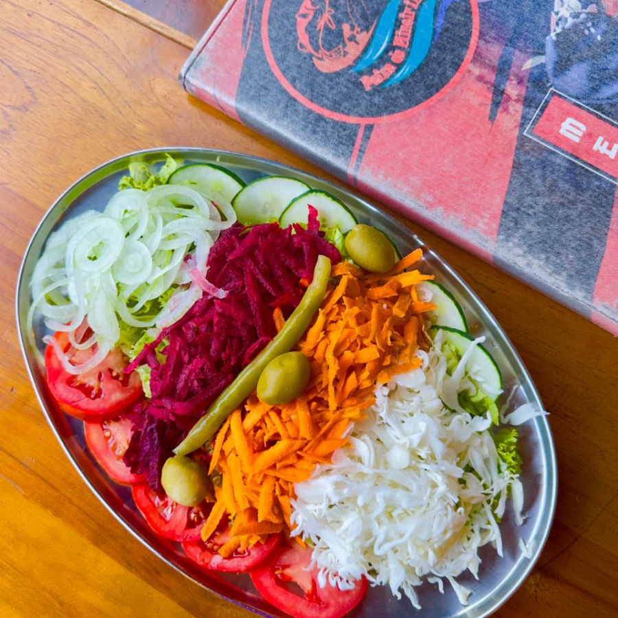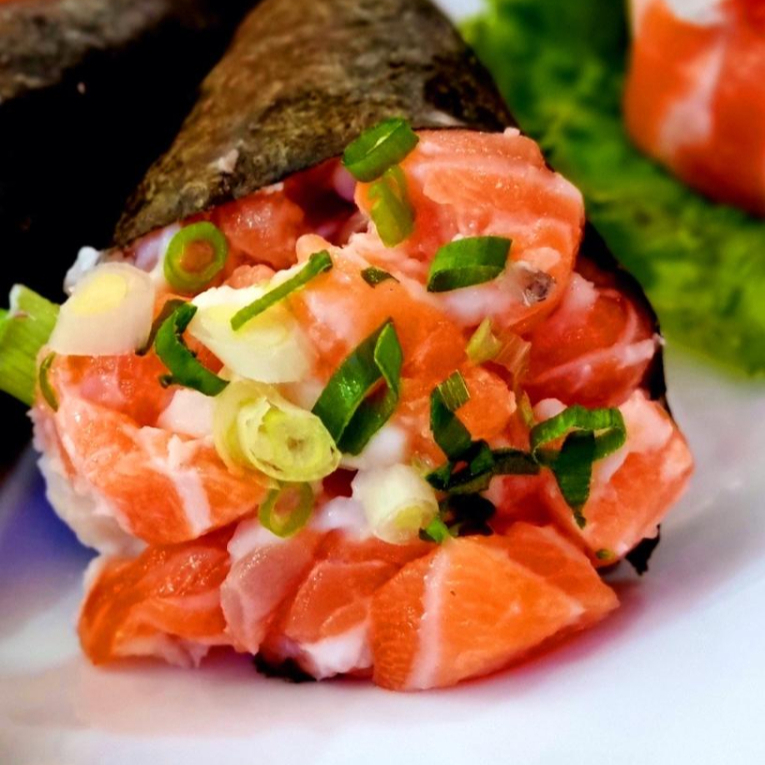 Enrolado de nori c/ salmão e kani por dentro couve a portuguesa, geleia de pimenta. acompanha cebolinha gergelim e creme chease ou maionese 6 unidades 1 hashi e 1 molho tarê sache.