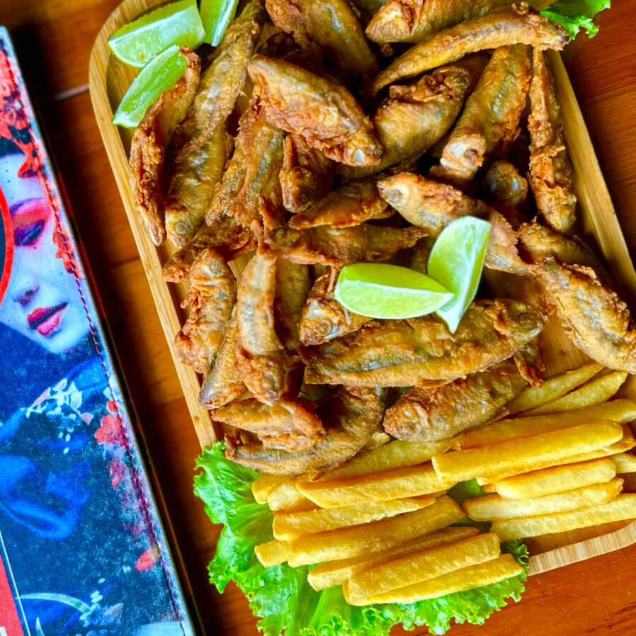 330 Gramas de Deliciosas manjubinhas emapanada e fritas - Acompanha 150 gramas batata frita mais 2 molhos rose - contém espinhos