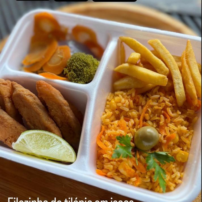 File de Tilapia em isca, empanada e frita, Arroz (a escolha bco ou a moda) , Batata frita (a escolha salada ou Legumes)