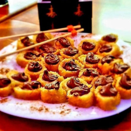 Banana empanada e frito com nutella por cima. Acompanha 1 hashi.