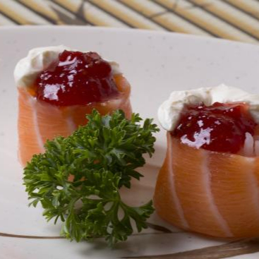 Bolinho de arroz com salmão enrolado - cream cheese e geleia de maracuja