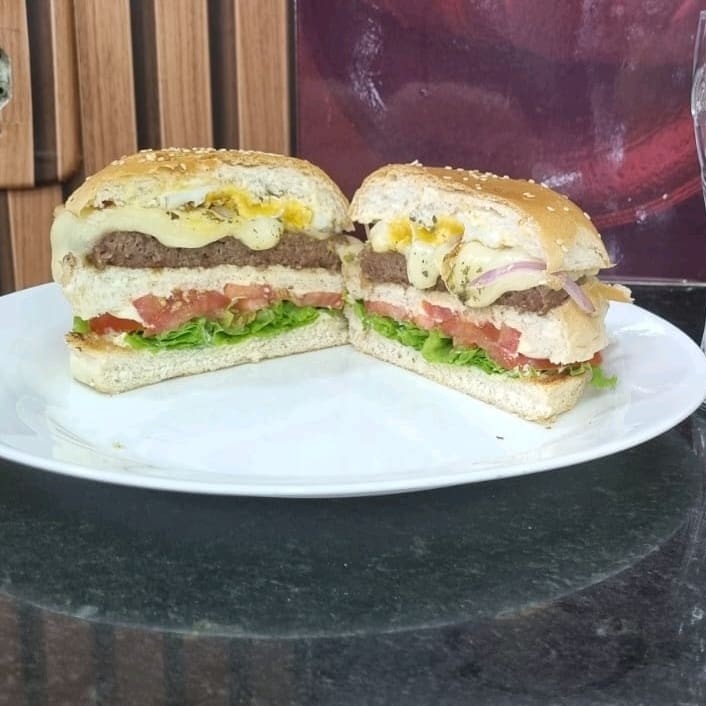 Pão com gergelim, hambúrguer de 90g, queijo, maionese e ovo