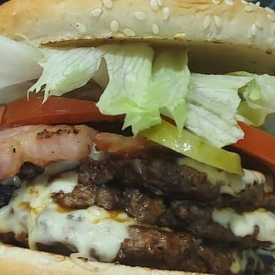 Dois suculentos hambúrgueres de 100g cada, cobertos com queijo mussarela perfeitamente derretido, Acrescentamos bacon em cubos para um sabor defumado, picles para o toque ácido, e fatias frescas de tomate e alface americana. (Não acompanha molho)