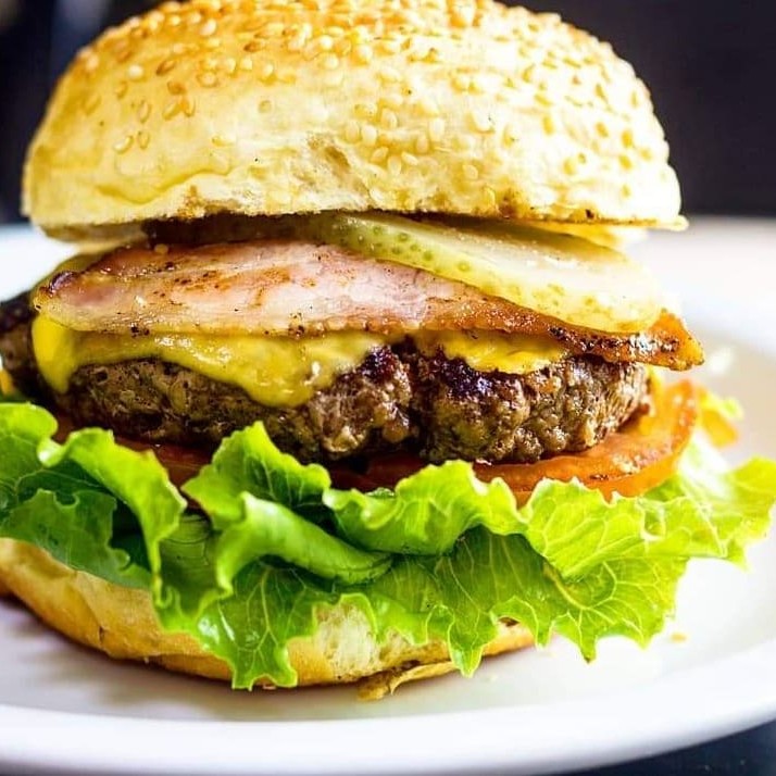 Hambúrguer de 170g, coberto com uma generosa fatia de queijo prato derretido. Acompanhado de crocante alface americana, delicioso bacon em cubos, picles e tomate fresco, (Não acompanha molho)