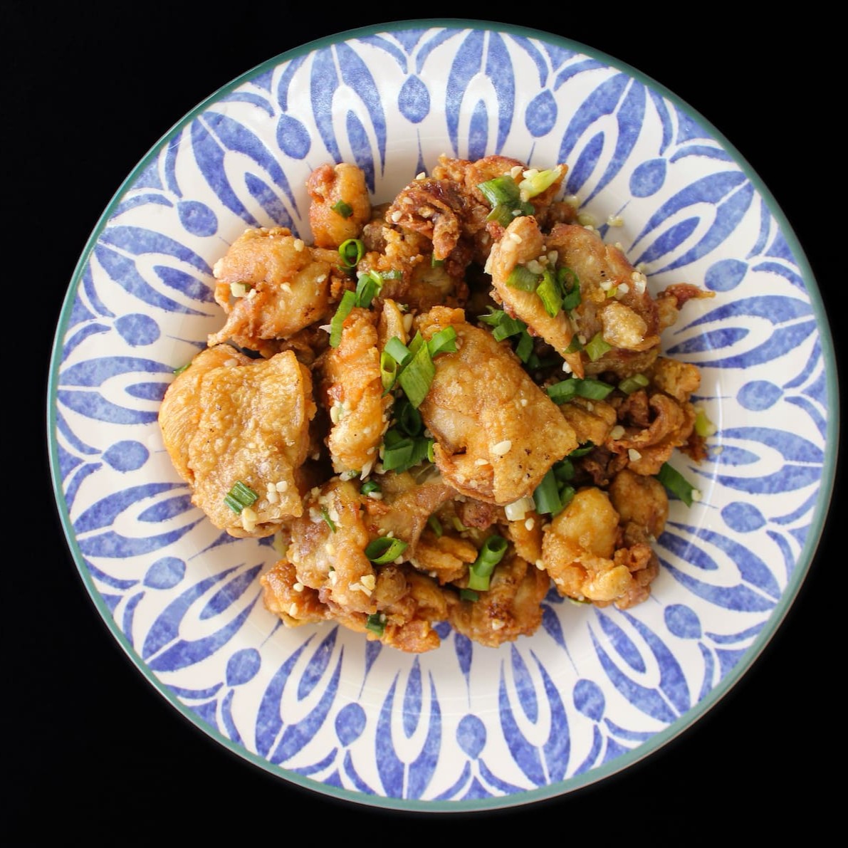 Pedaços de coxa e sobrecoxa desossados e fritos, acompanha molho gengibre que pode ser servido junto ou à parte.